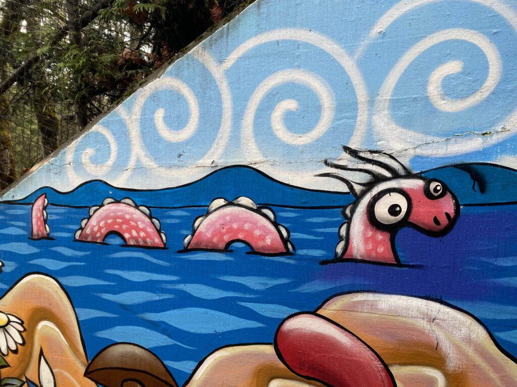 On the way to Bellingham, we took the scenic Chuckanut Drive and did a little hike to Wildcat Cove. Chuckanut Drive follows the bay and is a nice alternative to the highway. I liked this sea monster worm thing on a tunnel mural in Larrabee State Park.